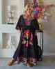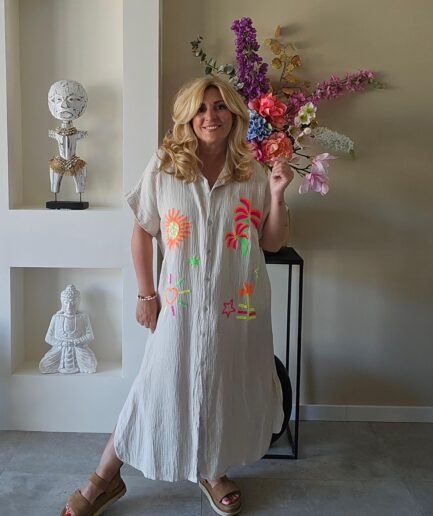 Strandjurk ideaal voor de zomer, met een V hals en V achterkant. Elastische tailleband. Geborduurd aan de voorkant. Jurk heeft 2 zakken.