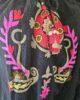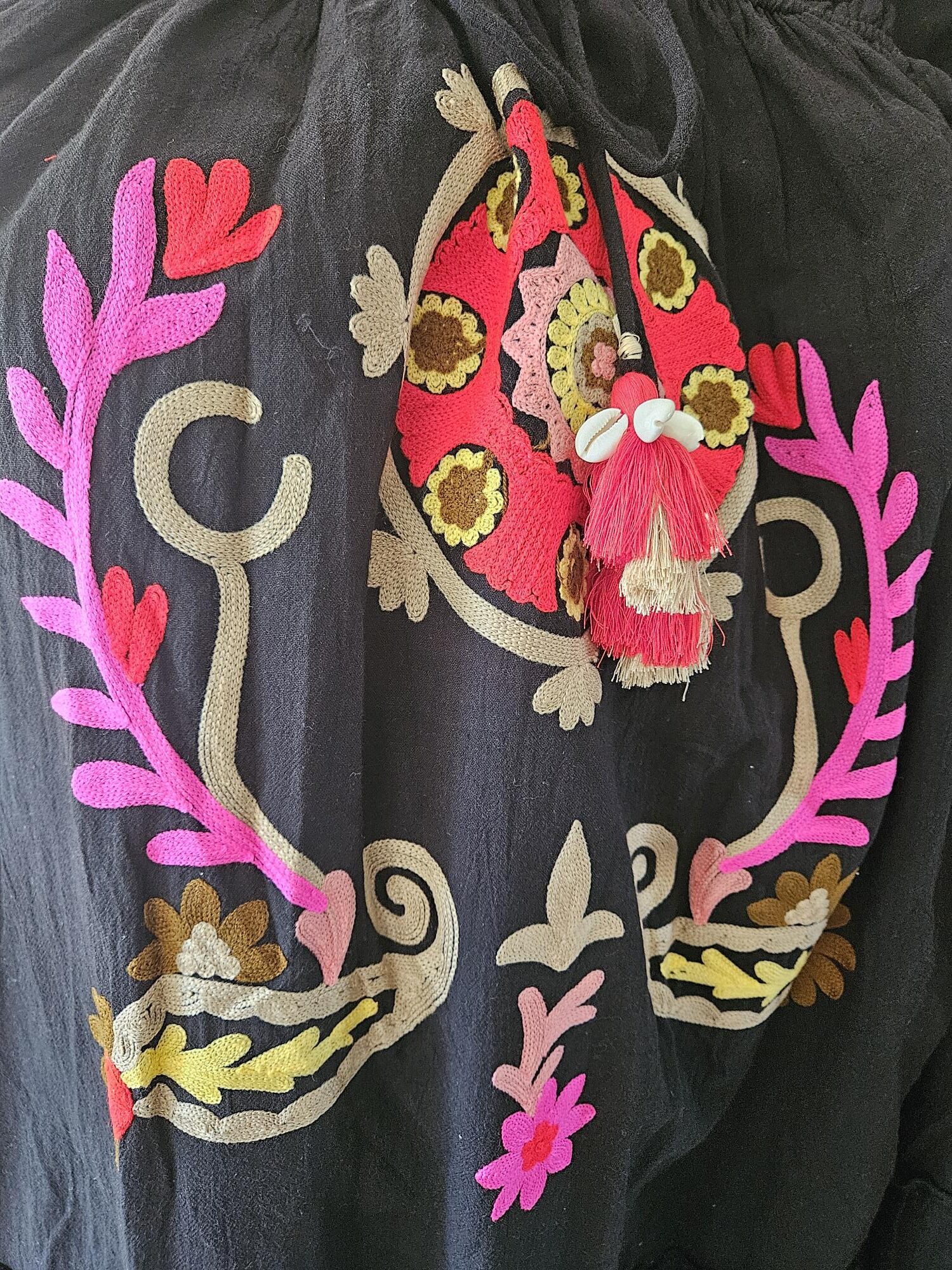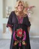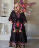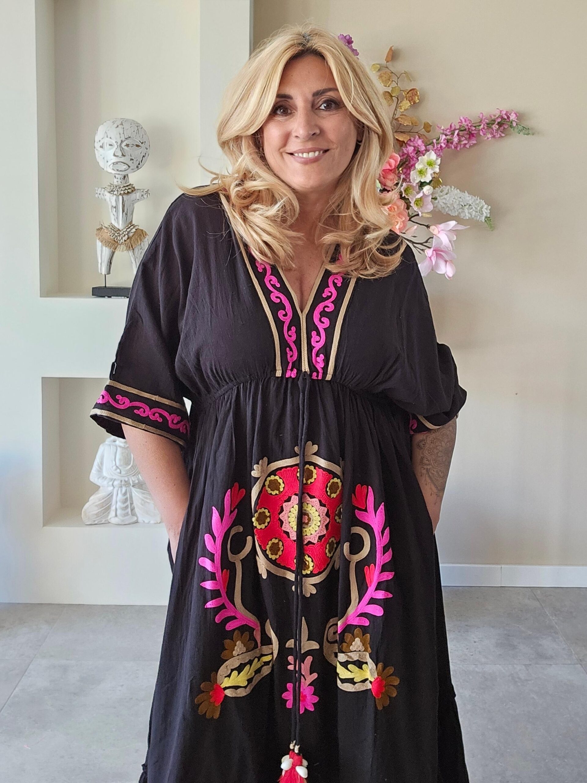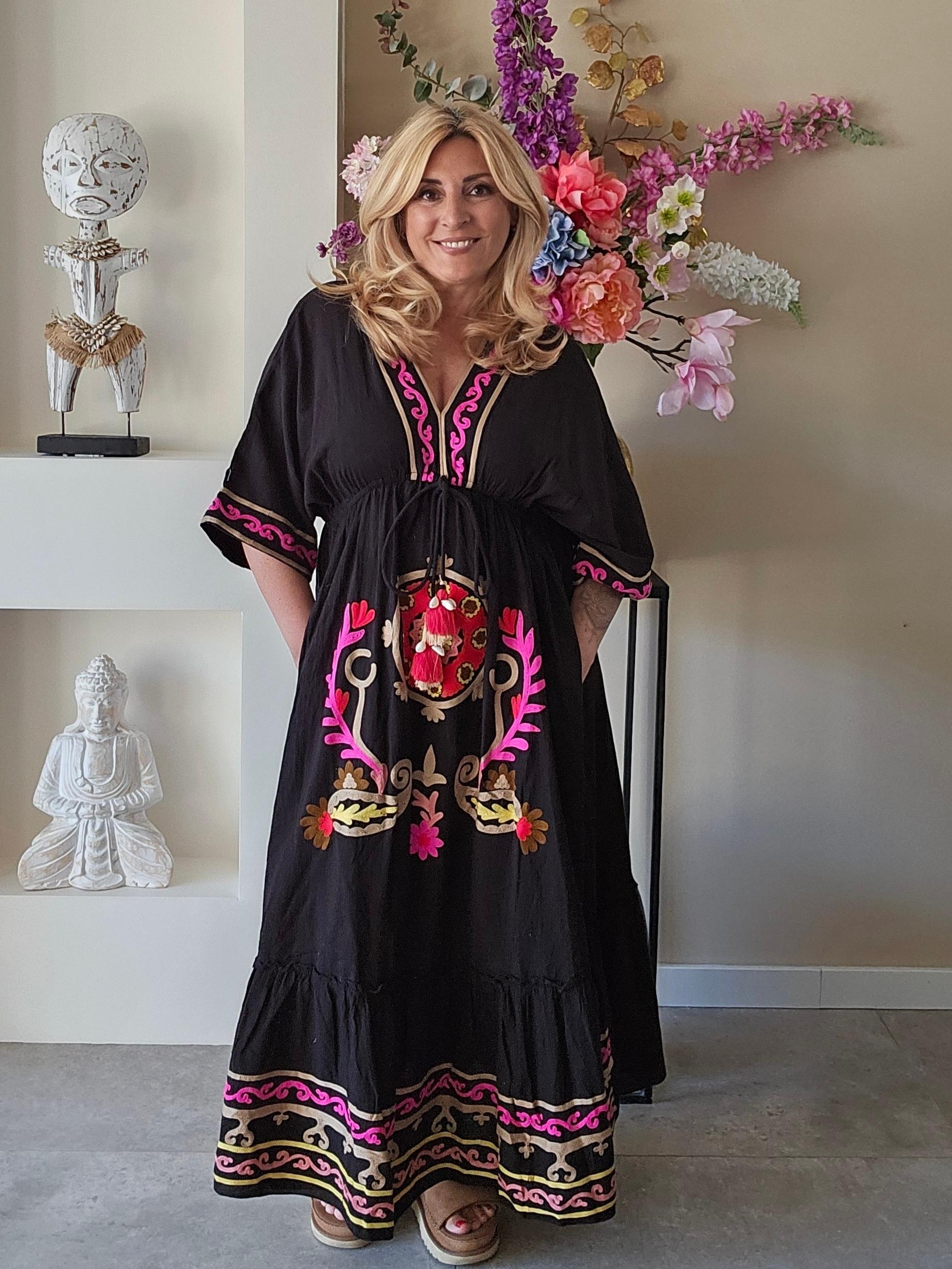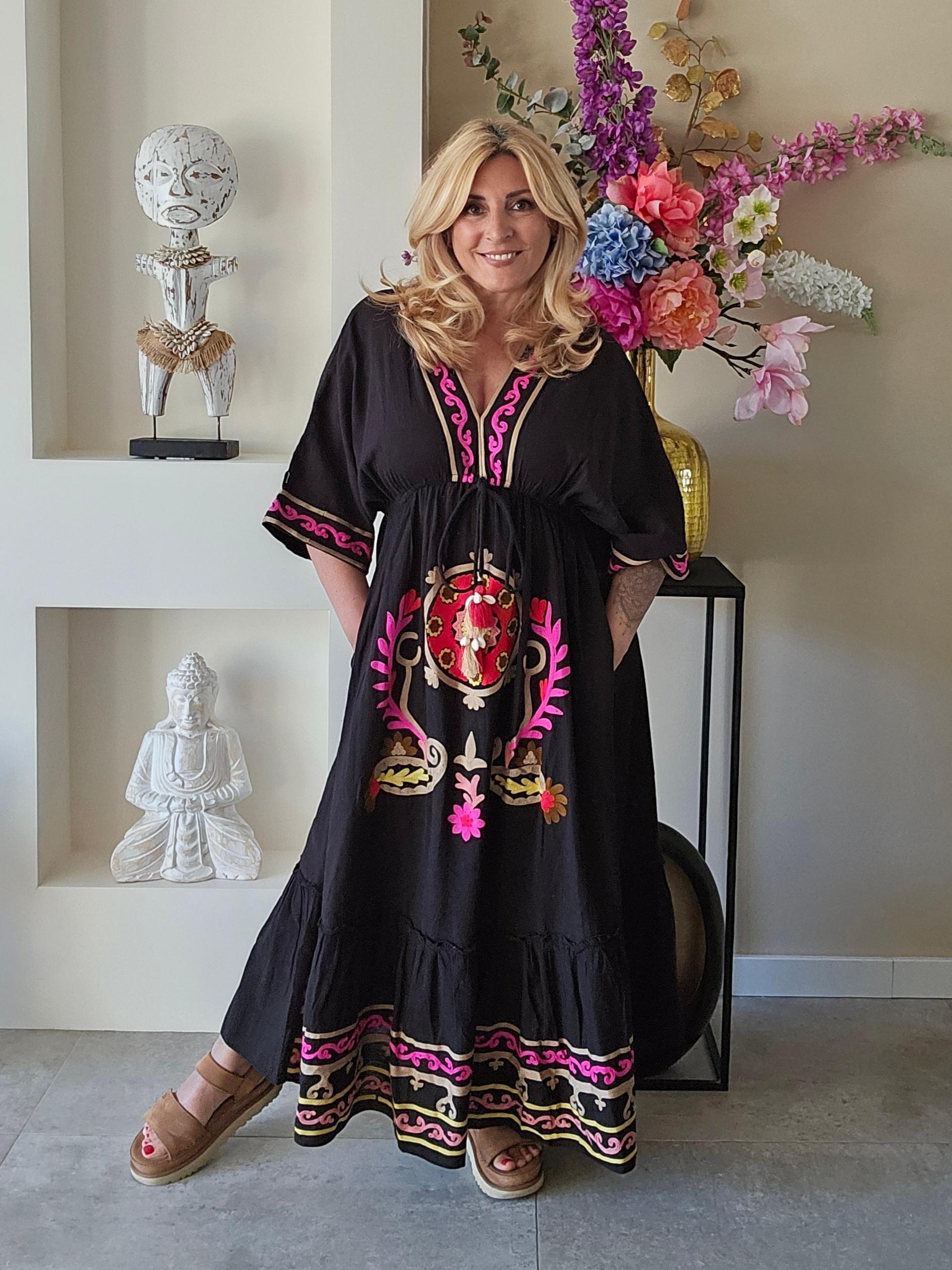 Strandjurk ideaal voor de zomer, met een blote rug. Goed te verstellen door 2 touwjtes aan de achterkant. Voorkant geborduurd met felle kleurtjes. Jurk heeft ook 2 zakken.